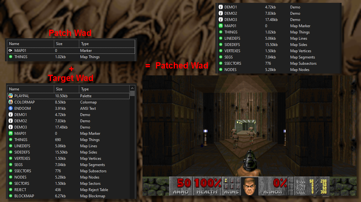 Obligatory Copyright Note: This tool is only meant to be used locally with your Doom IWADs, please don't go sharing around the patched WADs, as that is still unfortunately piracy. Please respect id's copyrights and whatnot. That being said, you are free to share the patch WADs however you want alongside basic instructions.